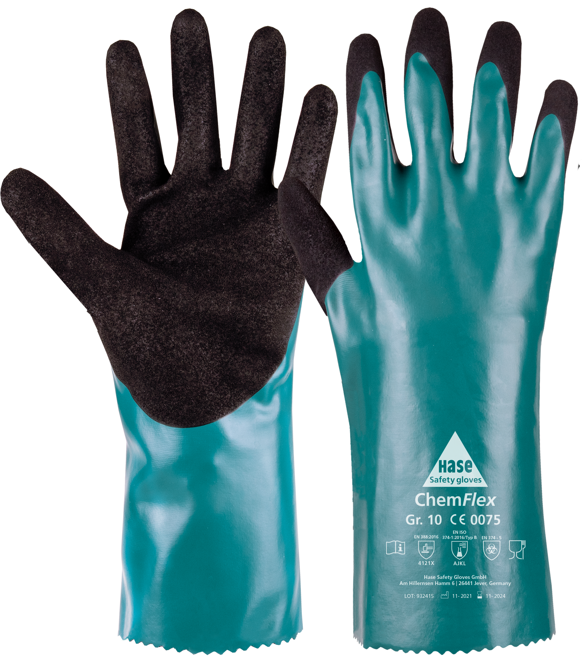 Chemikalienschutzhandschuh Typ B aus 18 Gauge Nylonfeinstrick, 3-fach Nitril getaucht mit Sandyfinish an Handinnenfläche und Fingerkuppen für besseren Grip bei trockenen, öligen und feuchten Teilen, lebensmittelgeeignet, AQL 1,5, Schichtstärke: 1,2 mm, Länge: 30 cm