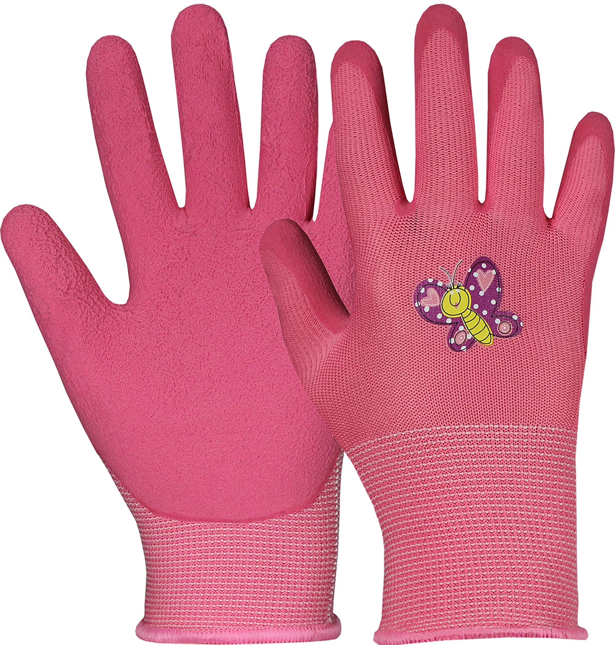 Kinderhandschuh aus elastischem Polyester mit Latex Beschichtung und einem Schmetterlingsmotiv auf dem Handrücken