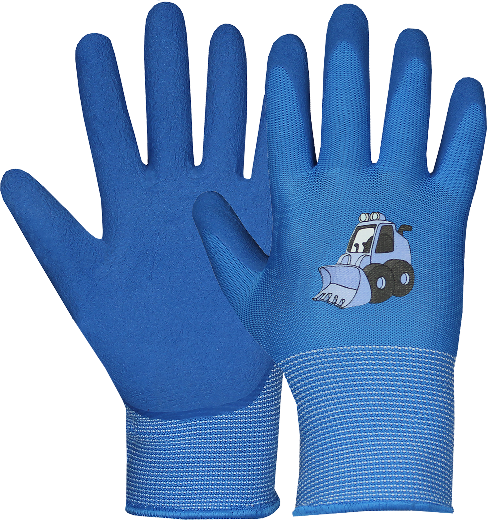 Kinderhandschuh aus elastischem Polyester mit Latex Beschichtung und einem Baggermotiv auf dem Handrücken